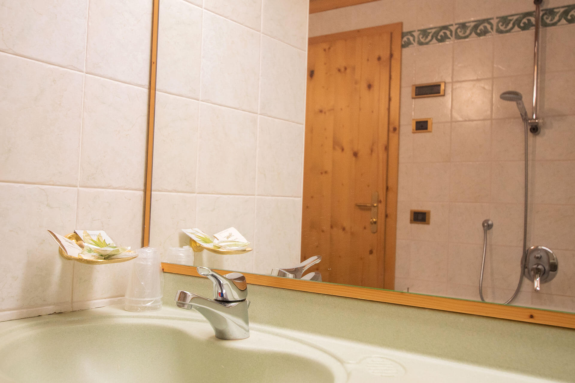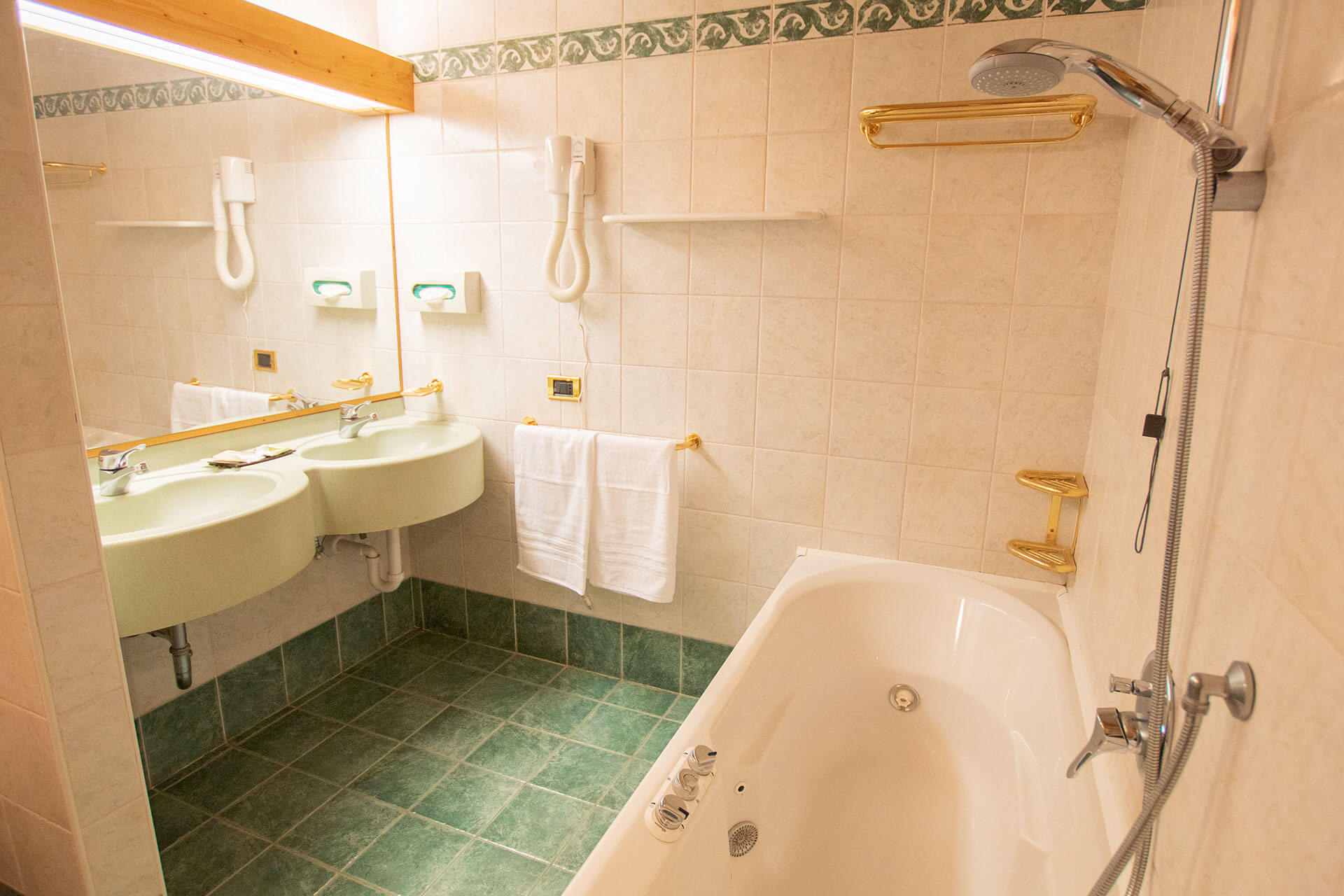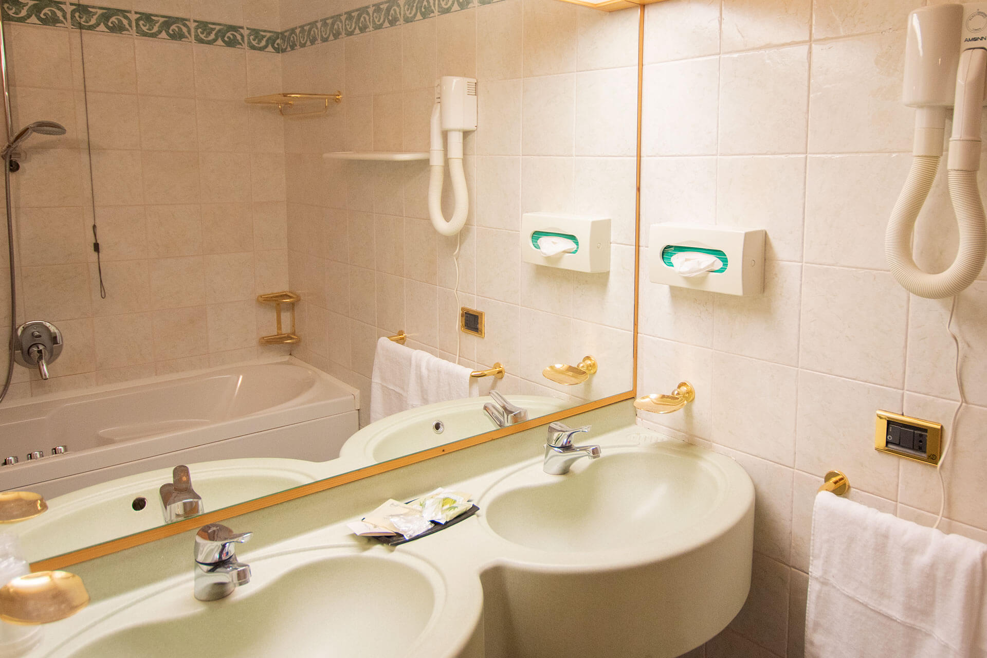 La camera è completa di tutti i servizi, ampia TV satellitare, radio, frigobar, telefono, cassaforte, asciugacapelli, oltre al kit sauna con accappatoio e ciabattine.